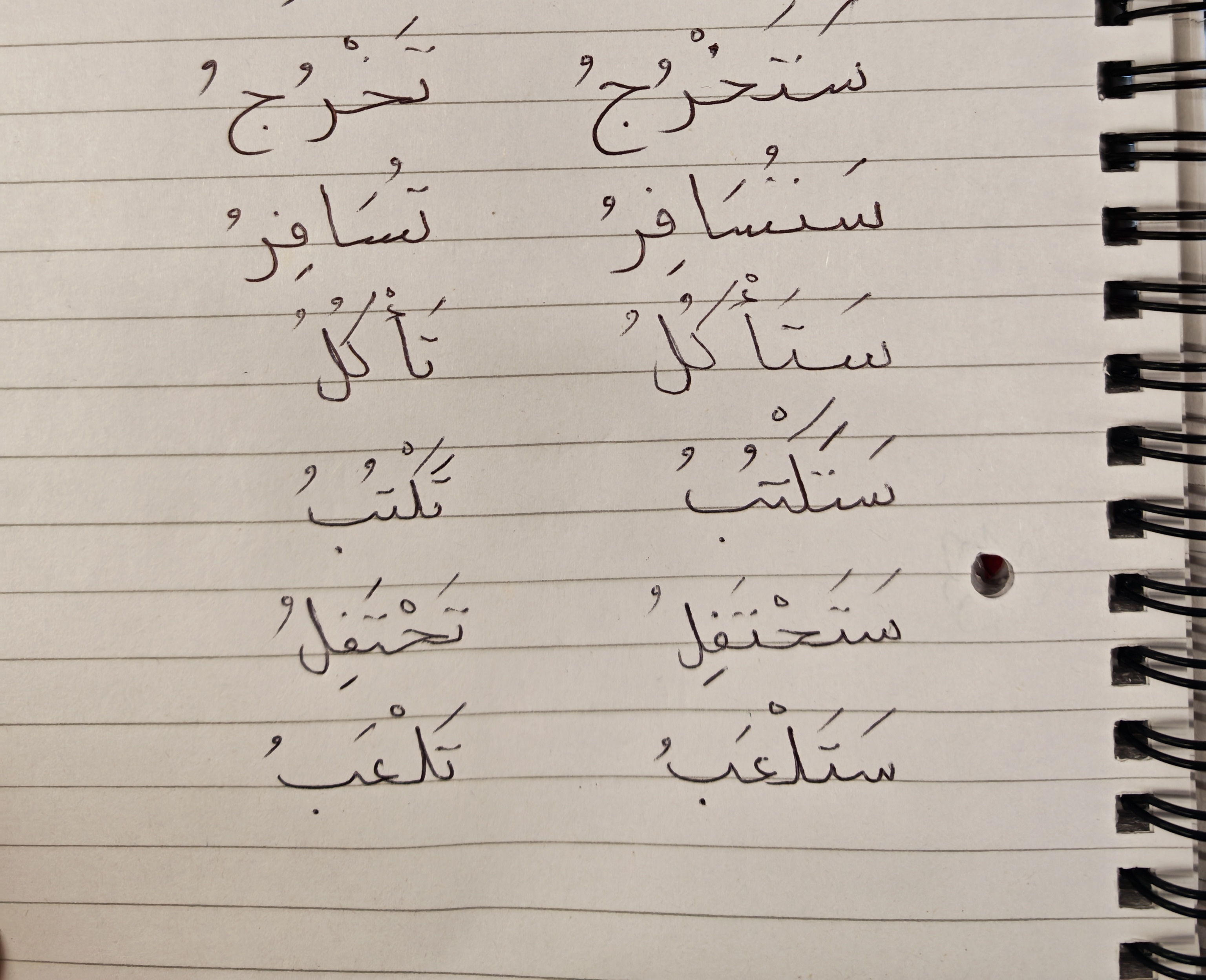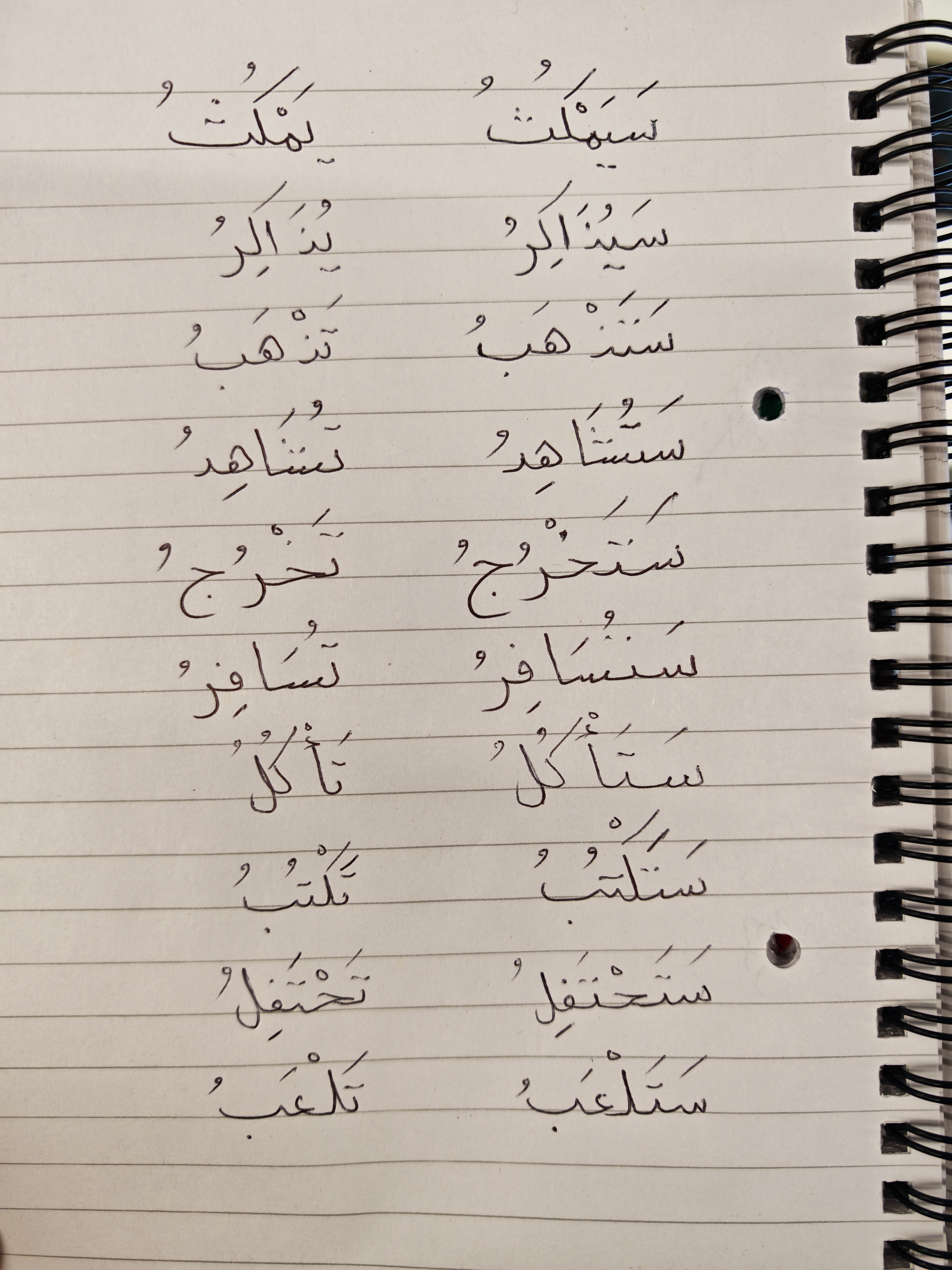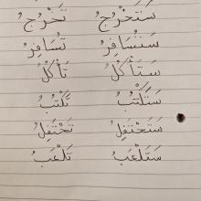 | Arabic Level 5 | We learnt how to say some verbs with أنا، هو وهي in the present tense and in the future. | How to write the following verbs with أنا، هو و هي in the present and in the future. |
