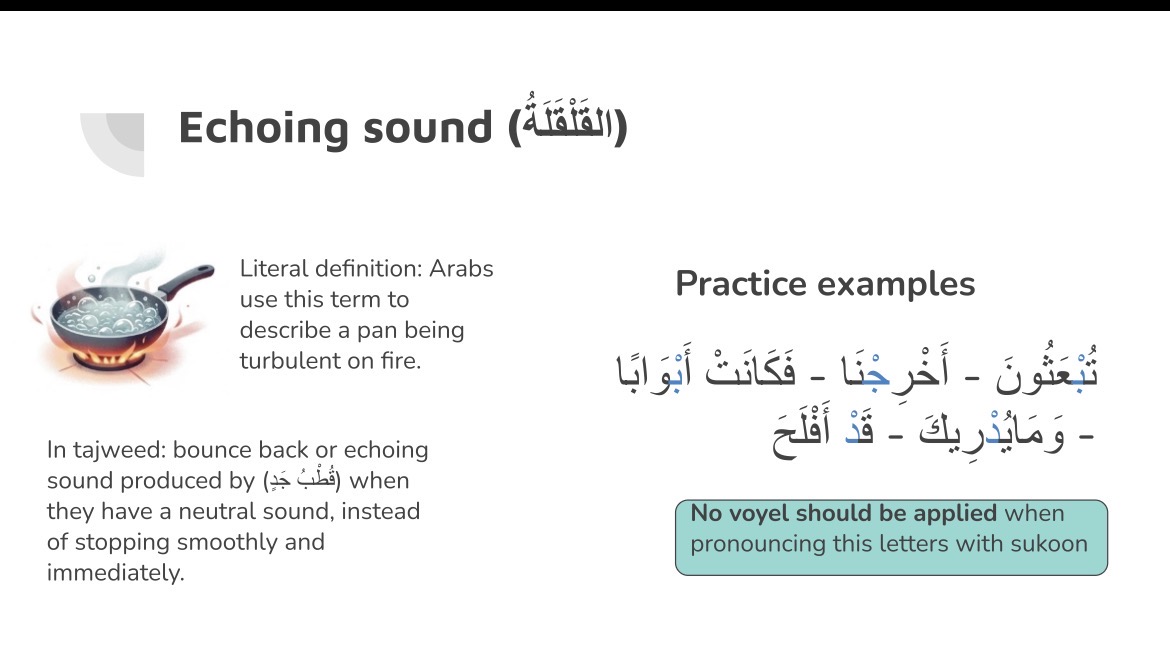 | Quran Level 6 | We spoke about Qalqalah in Tajweed and how to pronounce it. | Practice reading Surah Al-Ikhlas, Surah Al-Falaq and Surah Al-Masad.And focus on the Qalqalah rule in these Surahs. | |